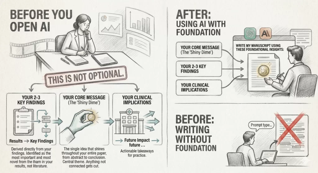 This is not optional. In my manuscript writing framework, the core message is what I call the “shiny dime.” It is the single idea that should shine throughout your entire paper, from abstract to conclusion. Think of it as the central theme of a film. Every scene serves that theme. Anything that does not connect to the core message gets cut. The core message is derived directly from your key findings. Not from the literature. Not from your original research question. From your results. You run the analysis, identify the 2-3 most important and most novel findings, and synthesize those into one overarching takeaway. Here is the order: Results → Key Findings → Core Message Not the other way around. This is what I mean by editing starting upstream. If you feed AI a vague prompt like “write a discussion section about psoriatic arthritis,” you will get a vague discussion section. Generic phrasing. Empty conclusions. Filler paragraphs that sound plausible but say nothing. ![]() The Kusumegi et al. Science study found that researchers who adopted LLMs posted dramatically more papers, but the increased output did not correspond to increased quality as measured by downstream citations and peer review acceptance. More volume, less signal. The antidote is not to avoid AI. It is to bring sharper thinking to the AI before it writes anything. But if you feed the AI your core message, your key findings, and the specific studies that support them, you get a draft that is already 60% of the way to being publishable. That remaining 40% is where your expertise, judgment, and taste come in. And that is what Steps 3-7 are about. Action step: Before your next AI writing session, fill out these 5 key manuscript elements in order:
