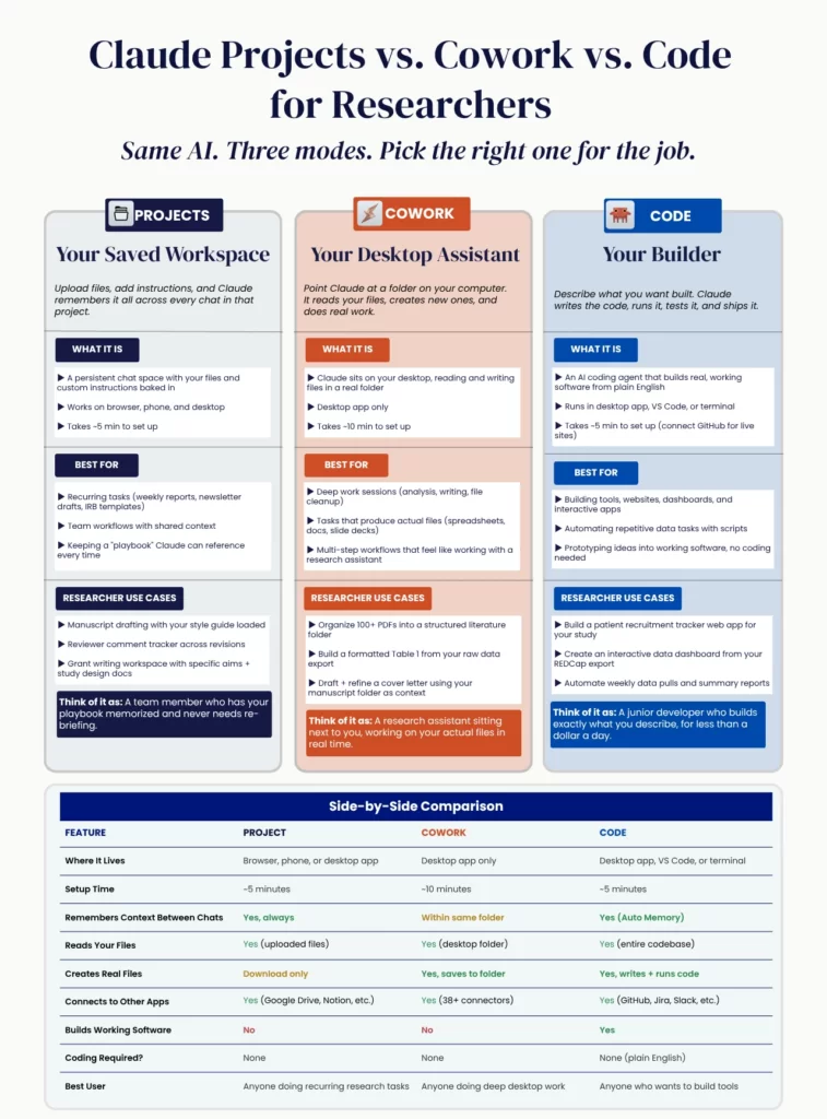 The Complete Researcher’s Guide to Getting Started With Claude Projects vs Cowork vs Code Read at RisingResearcherAcademy.com. In this post, we will be discussing how to pick the right Claude for your research work. (Because there are 3 now. And you’re probably only using 1.) I kept hearing people say: “I use Claude for everything.” That’s like saying “I use Microsoft for everything” without knowing the difference between Word, Excel, and PowerPoint. Claude now has 3 distinct modes. Each one solves a different problem. Before I break them down, let me tell you how I got here. My Switch (And Why I Wish I’d Done It Sooner)I used ChatGPT as my primary AI tool for almost two years. I had built-in projects, custom GPTs, and daily workflows. Memory was sticky. Everything was dialed in. I used Claude occasionally, but never committed. Then Claude released Cowork and Opus 4.6. I first realized something had shifted when I was testing models for Research Boost. For context: every time a major model drops, we test it against each step of the academic writing process. Introduction drafting. Methods structuring. Results interpretation. Discussion framing. Literature grounding. We run the same prompts, the same source material, the same evaluation criteria across all models. When Claude’s latest models started outperforming on the writing-heavy stages, specifically the nuanced work like framing a Discussion section or synthesizing conflicting evidence from multiple papers, that’s when I decided to go deep. The context window was substantially larger (approximately 750,000 words). The writing quality was noticeably better. Not “slightly better on a benchmark” better. Better in the way that matters to researchers: it could hold my entire manuscript draft, my study protocol, and my reviewer comments in memory at the same time and produce output that actually sounded like a human wrote it. So I gave it a full try. I switched slowly over the course of a month. Now I’m kicking myself for not doing it earlier. For knowledge workers, and specifically those in research, Claude is hands down the best AI to use right now. I still use ChatGPT and Gemini for specific tasks. But Claude is my main engine. If you’ve been using ChatGPT only, I’d encourage you to try Claude again. To use the full capabilities we’ll discuss below, you do need a Pro plan at $20/month. I’d start there and see if you get value out of it within the first week. (Full disclosure: I have no affiliation with Anthropic. I’m just telling you what works.) Now, here’s the thing that surprised me. When I switched, I didn’t just discover a better chatbot. I discovered that Claude isn’t one tool anymore. It’s three. Claude Projects = your saved workspace (think: a persistent research environment that remembers everything) Claude Cowork = your desktop research assistant (think: an RA who works on your actual files) Claude Code = your personal builder (think: a junior developer who builds whatever you describe in plain English) Same AI brain. Three different environments. Three different jobs. Let me walk you through each one. ![]() 1. Claude Projects: Your Saved WorkspaceThis is where most researchers should start. And it’s the closest to what you’re already used to. What It Actually IsA Project is a persistent workspace inside Claude where you upload files and write custom instructions that stick across every conversation. Every time you start a new chat inside that Project, Claude already has your files loaded and your instructions memorized. You don’t re-explain anything. It works on your browser, your phone, and the desktop app. Setup takes about 5 minutes. The Problem It SolvesYou know the frustration. You spend 10 minutes giving Claude context about your study design, your variables, your target journal, your writing preferences… and then tomorrow, you start over from scratch. Projects eliminate that entirely. You create a Project once. Upload your relevant files. Write your instructions. And every single conversation inside that Project begins with full context. No re-uploading your manuscript draft. No reminding Claude you write in active voice and despise the phrase “it is well-established that.” How to Set It Up (5 Minutes)1. Open claude.ai 2. Click “Projects” in the left sidebar ![]() 3. Click “Create a new project” 4. Name it something specific: “Hypertension Manuscript, JAHA Submission” 5. Write custom instructions in the Project description ![]() 6. Upload your key files: manuscript draft, study protocol, target journal guidelines ![]() What to Put in Your Project InstructionsThis is the part most people skip. It’s also the part that makes the biggest difference. Your Project instructions are like an onboarding document for a new research assistant. You write it once. Claude follows it for every conversation in that Project. Here’s a template I use: